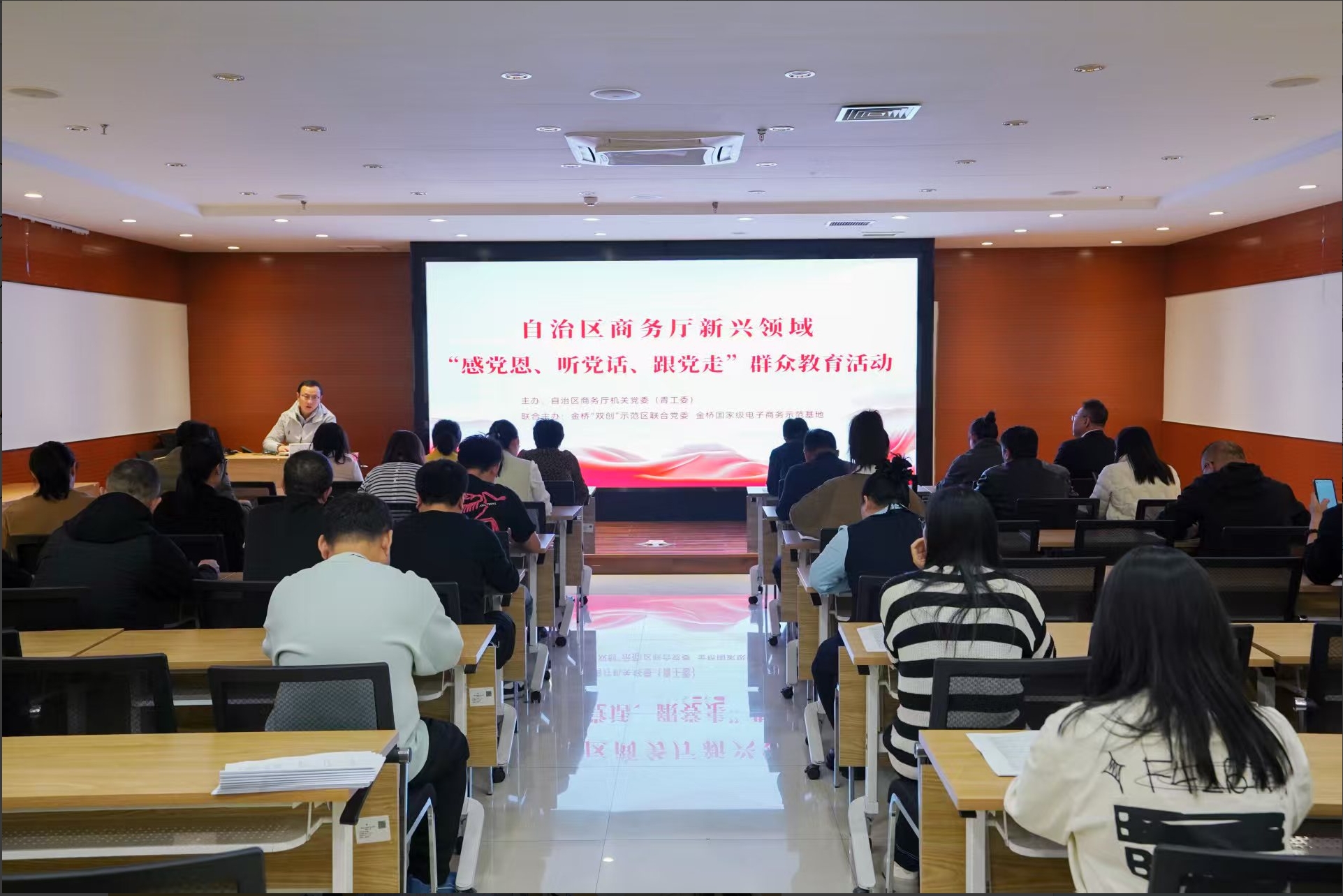 为巩固深入贯彻中央八项规定精神学习教育成果,推进“两个覆盖”集中攻坚行动走深走实,进一步深化“感党恩、听党话、跟党走”群众教育,扩大党在新兴领域的凝聚力号召力影响力,10月24日,自治区商务厅联合金桥“双创”示范区联合党委、金桥国家级电子商务示范基地举办新兴领域“感党恩、听党话、跟党走”群众教育活动。商务厅相关处室、金桥国家级电子商务示范基地部分企业代表、联系指导的行业商协会有关负责同志和行业商协会党支部的党务工作者等40余人参加活动。