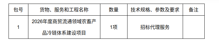 为进一步加强管理,规范采购行为,确保2026年度商贸流通领域农畜产品冷链体系建设项目评审工作顺利完成,现邀请符合资格条件的招标代理服务机构前来报名参加。